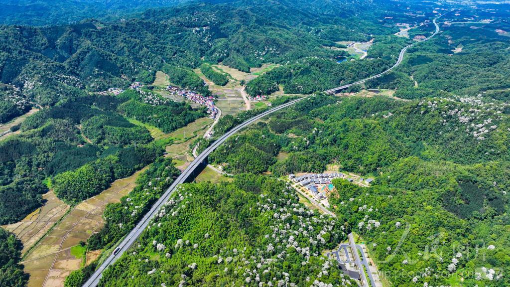 2024年5月14日,在江西省宜春市宜丰县同安乡,高速公路跨越山川田野,与青山、村庄相互映衬,构成一幅美丽生态画卷。 近年来,江西省宜春市宜丰县持续加大交通路网建设力度,完善现代化交通运输体系,不断提升交通运输效率,切实改善群众交通出行条件,有效推动经济社会高质量发展,助力乡村全面振兴。