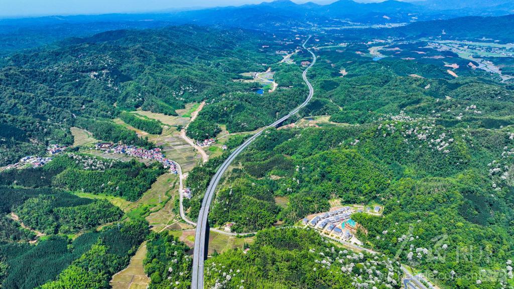 2024年5月14日,在江西省宜春市宜丰县同安乡,高速公路跨越山川田野,与青山、村庄相互映衬,构成一幅美丽生态画卷。
