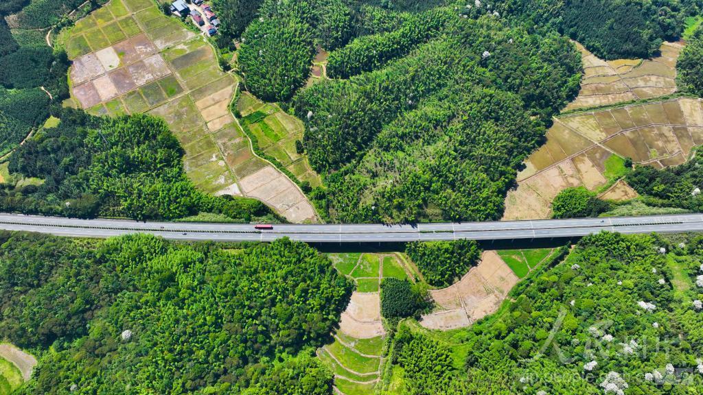 2024年5月14日,在江西省宜春市宜丰县同安乡,高速公路跨越山川田野,与青山、村庄相互映衬,构成一幅美丽生态画卷。