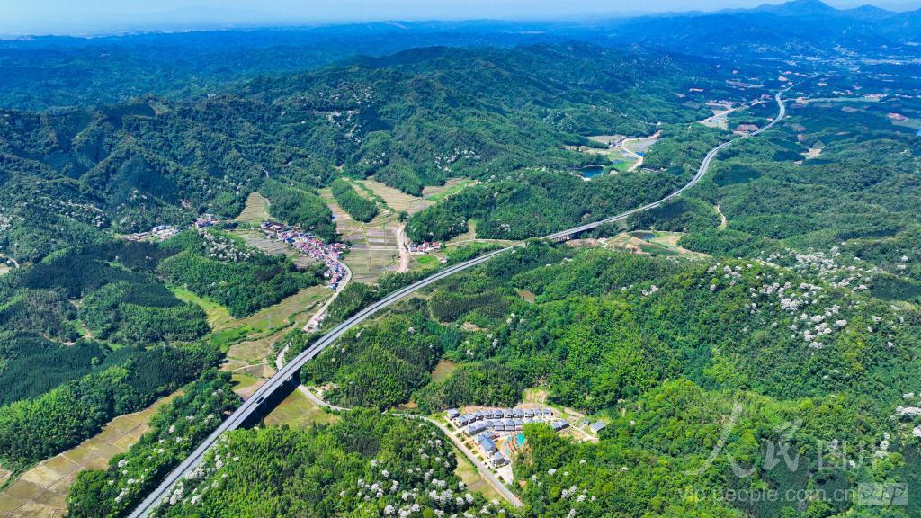 2024年5月14日,在江西省宜春市宜丰县同安乡,高速公路跨越山川田野,与青山、村庄相互映衬,构成一幅美丽生态画卷。