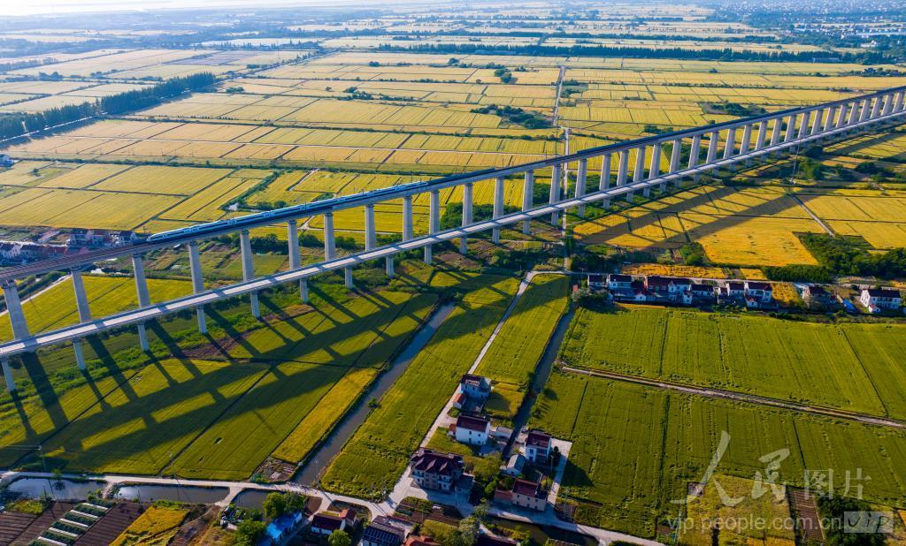 2024年5月16日,动车组列车从沪苏通长江公铁大桥江苏省张家港市境内疾驶而过,与周边金色的麦田、错落有致的农宅,构成一副生态乡村美丽田园画卷。