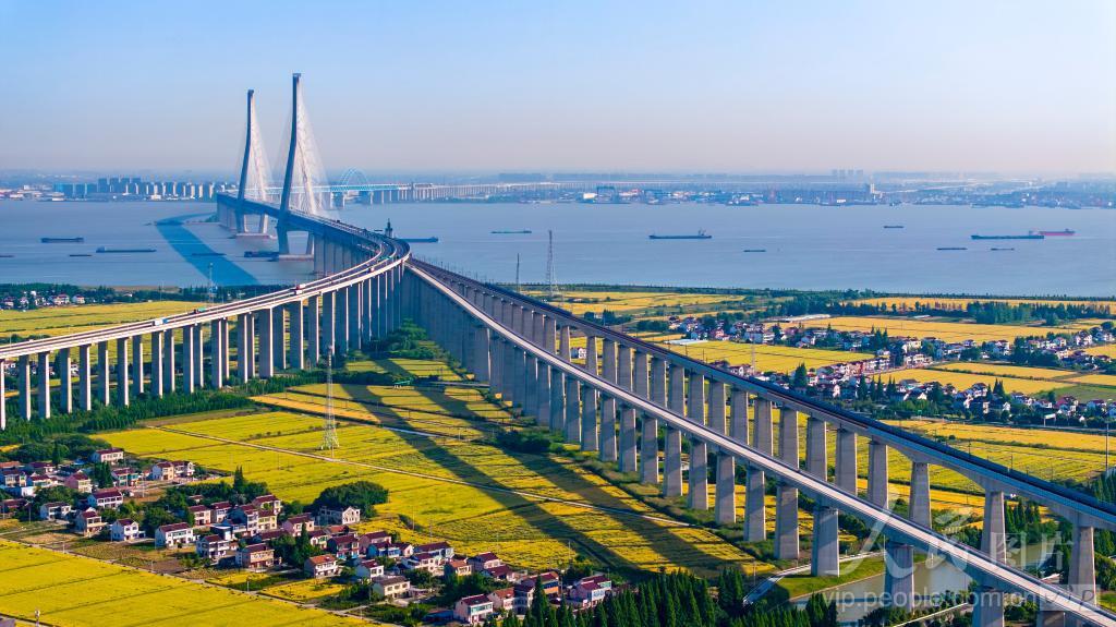 2024年5月16日,动车组列车从沪苏通长江公铁大桥江苏省张家港市境内疾驶而过,与周边金色的麦田、错落有致的农宅,构成一副生态乡村美丽田园画卷。