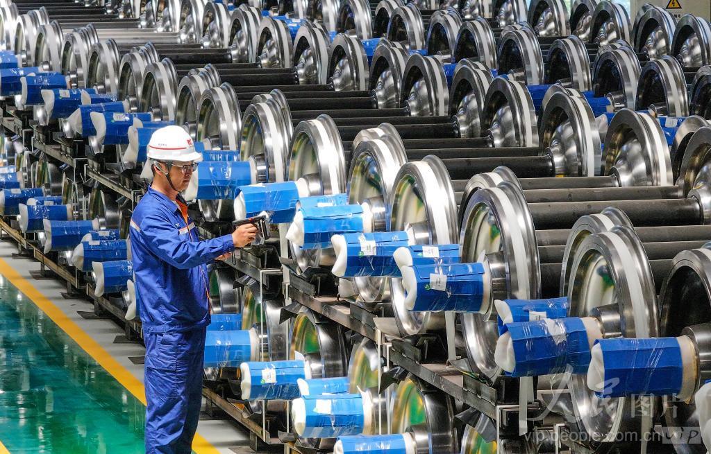 2024年5月16日,安徽省马鞍山经开区的宝武集团马钢轨交材料科技有限公司南区生产基地,员工在检验发往国外的轮对产品。