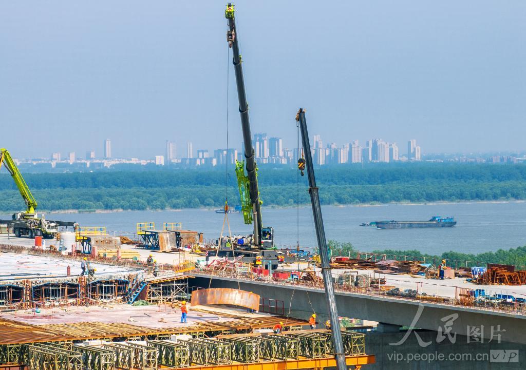 2024年5月19日,巢马城际铁路马鞍山大桥主汊航道桥建设现场一片繁忙,人们正坚守岗位高标准完成各项建设任务。