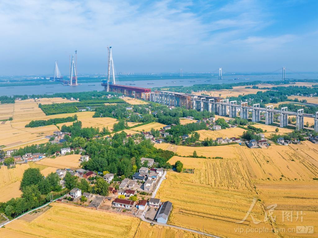 2024年5月19日,巢马城际铁路马鞍山大桥主汊航道桥建设现场一片繁忙,人们正坚守岗位高标准完成各项建设任务。