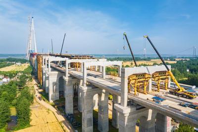 2024年5月19日,巢马城际铁路马鞍山大桥主汊航道桥建设现场一片繁忙,人们正坚守岗位高标准完成各项建设任务。