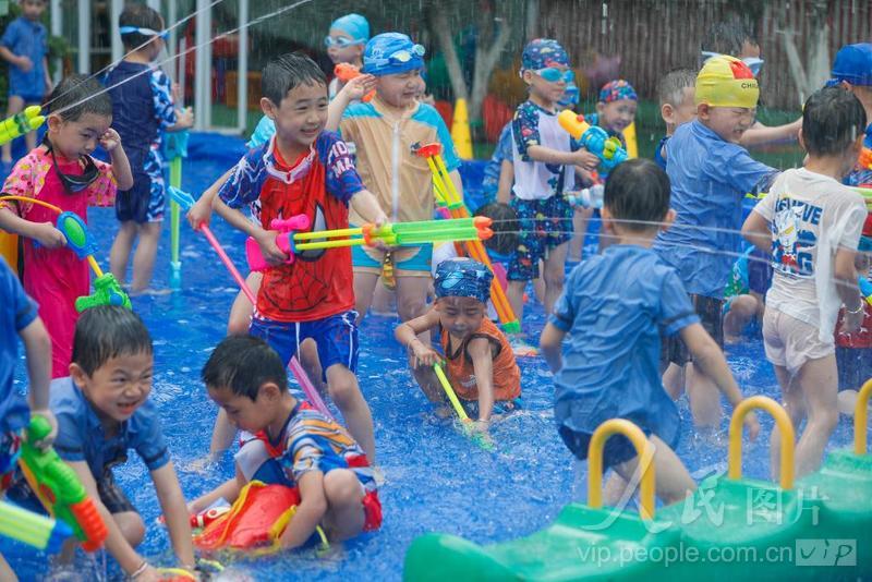 2024年5月29日,江西省吉安市吉州区保育院的小朋友在“水上派对”中玩耍。