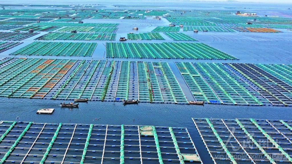 2024年6月4日,在山东省荣成市一处海洋牧场,养殖工人驾驶养殖船穿梭于养殖区,从事海带收获、贝类夏管等各种海水养殖作业。 近年来,荣成市在多处海洋牧场采用立体养殖技术——浅海多营养层次生态养殖模式:上层养殖海带、裙带、龙须菜等藻类,中层养殖贝类,底层是人工鱼礁。这种模式既能形成自给自足的生态循环,降低空气中的二氧化碳总量,又能提高养殖效益,形成了生态效益、经济效益双提升。