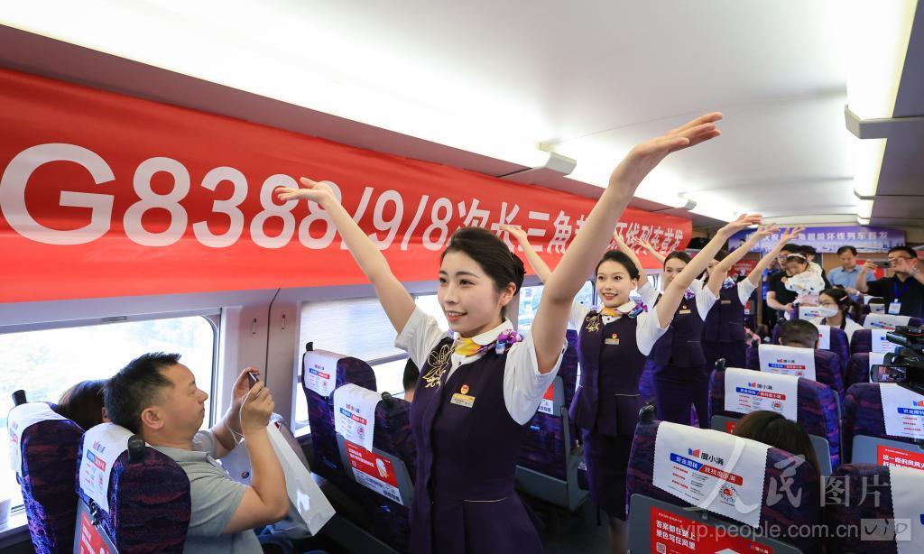 2024年6月15日,在长三角环线高铁列车上,南京客运段乘务员为旅客表演节目。