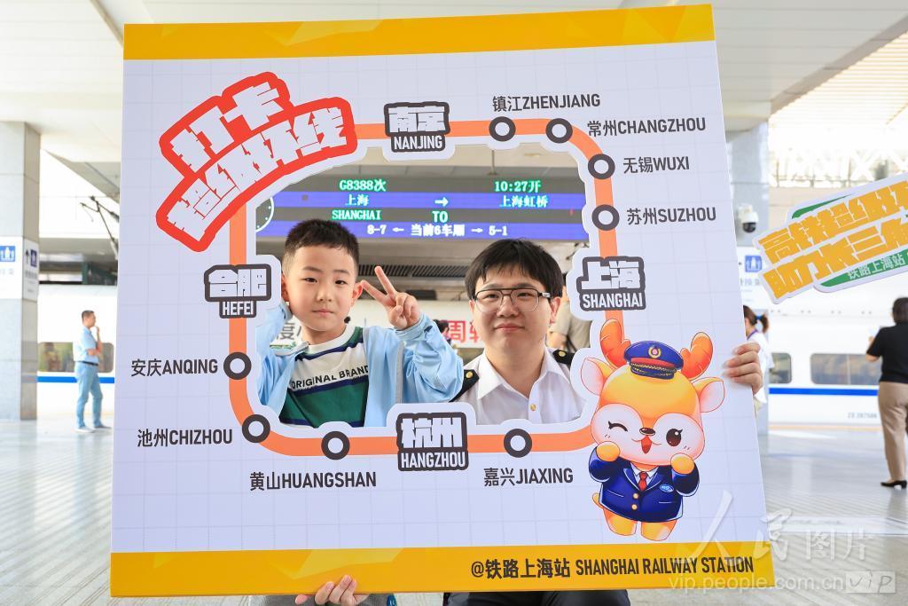 2024年6月15日,在上海火车站,一名小旅客在长三角环线高铁列车前留影。