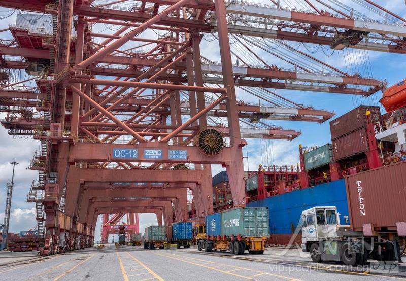近日在广东广州南沙港集装箱码头,大型集装箱货轮装卸作业,集装箱卡车来回穿梭,一派繁忙有序景象。