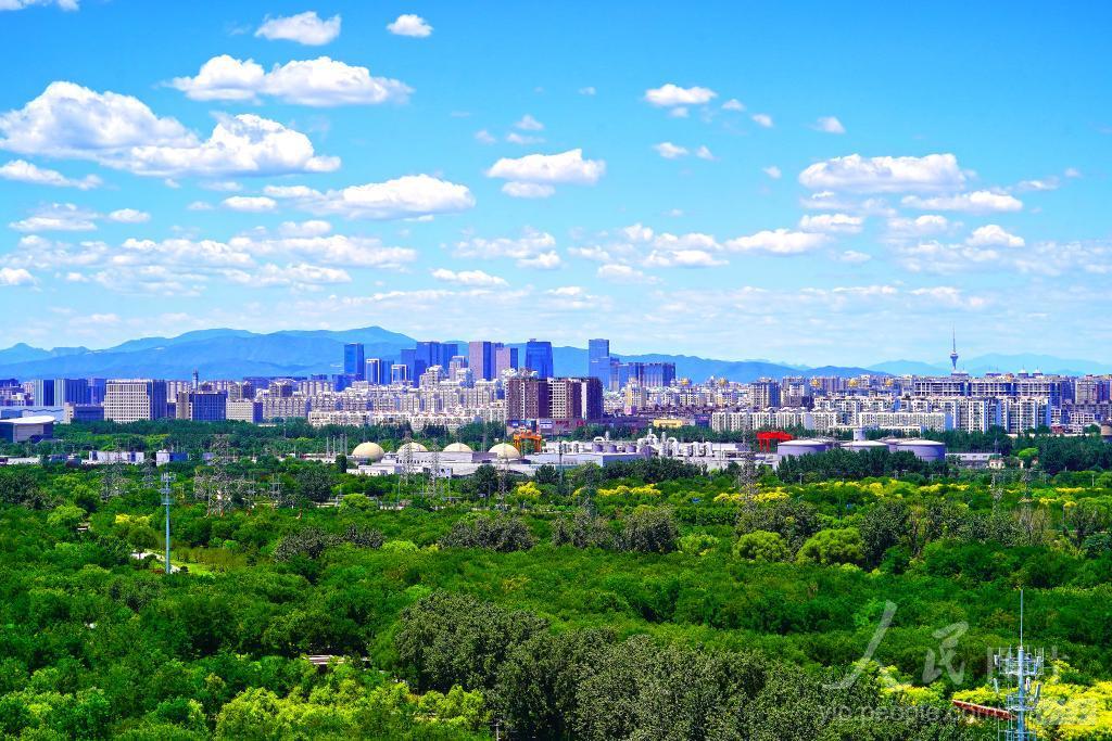 2024年6月24日,北京天空湛蓝,白云悠悠,迎来“高颜值”好天气。在南苑森林湿地公园59米高观景台俯瞰南城。郁郁葱葱的树林、城市建筑、蓝天白云构成一幅美丽的自然生态画卷。