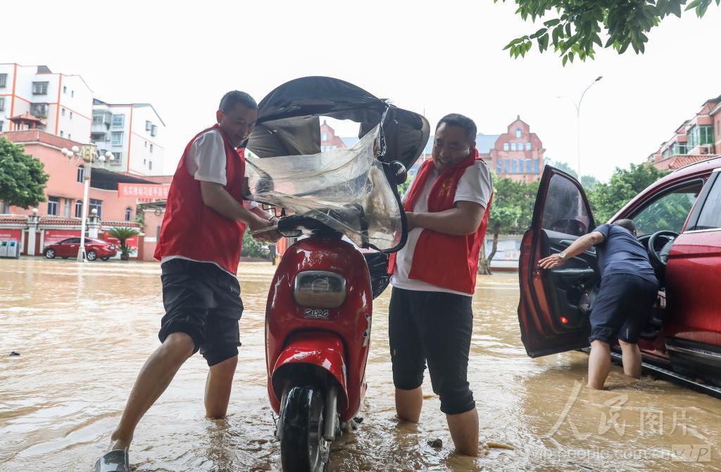 2024年7月11日,垫江县澄溪镇政府工作人员在搬运市民的摩托车。