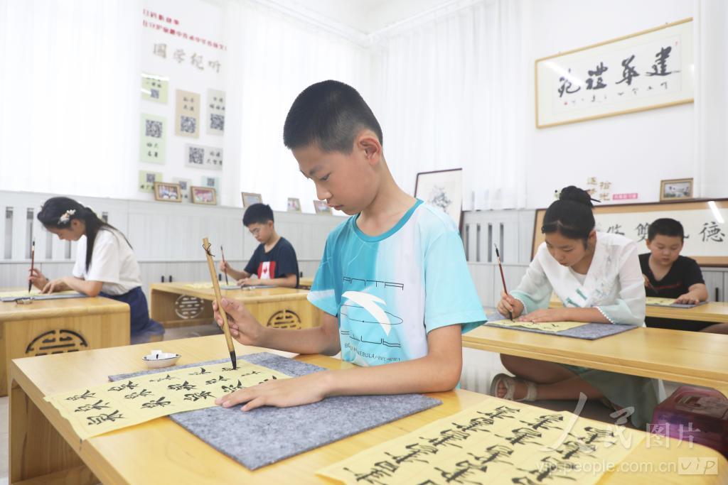 2024年7月11日,孩子们在河北省唐山市丰润区燕山路街道建华二社区暑托班上练习书法。
