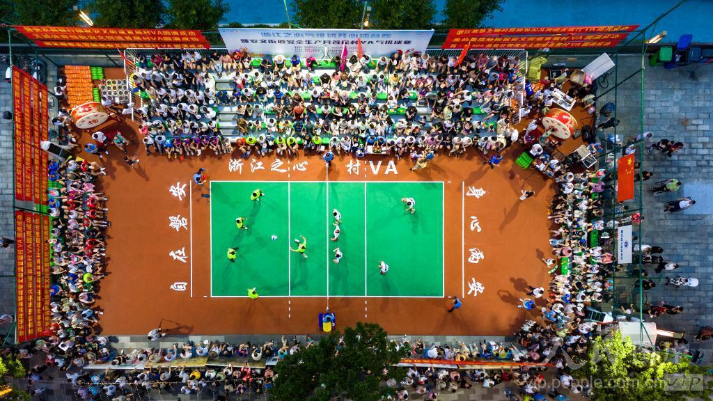 2024年7月10日晚,俯瞰浙江省金华市磐安县安文街道宝龙广场,首场村“VA”气排球决赛在激烈进行中。