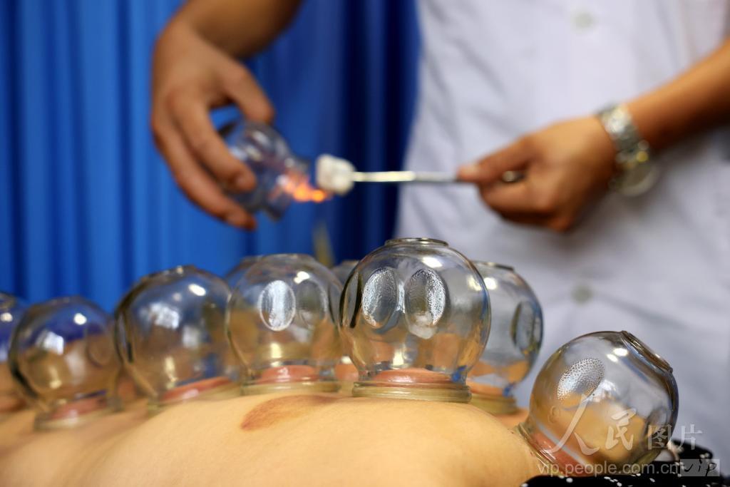 2024年7月15日,山东省枣庄市文化西路一家中医门诊的医务人员在给市民进行“拔火罐”治疗。