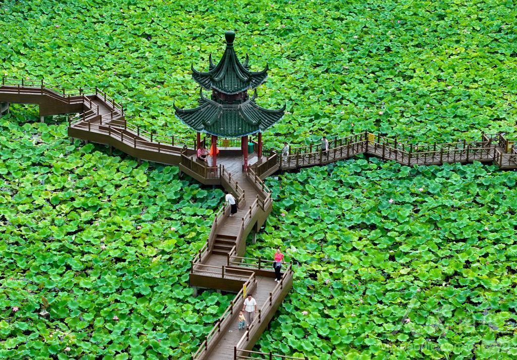 2024年7月15日,在安徽省亳州市谯城区一荷花塘拍摄的夏日美景。 盛夏时节,在安徽省亳州市谯城区一处荷塘里,莲叶如盖,木道蜿蜒,绽放的荷花粉嫩醉人。一场大雨过后,景色更加清新宜人,吸引了不少市民来到这里赏花观景。