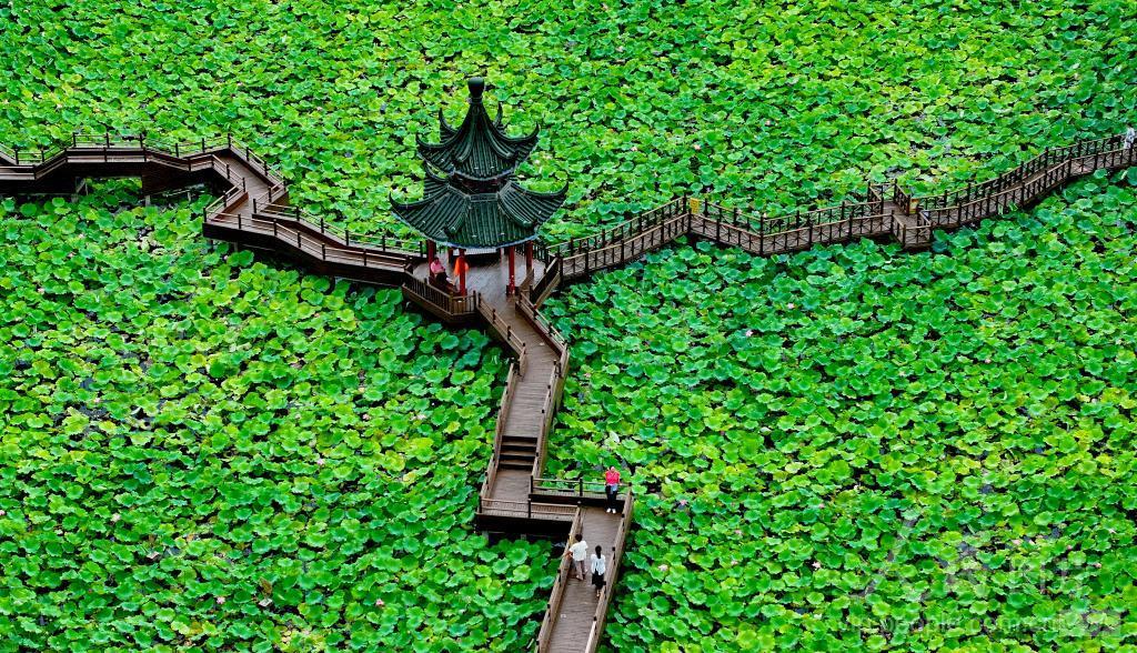 2024年7月15日,在安徽省亳州市谯城区一荷花塘拍摄的夏日美景。 盛夏时节,在安徽省亳州市谯城区一处荷塘里,莲叶如盖,木道蜿蜒,绽放的荷花粉嫩醉人。一场大雨过后,景色更加清新宜人,吸引了不少市民来到这里赏花观景。