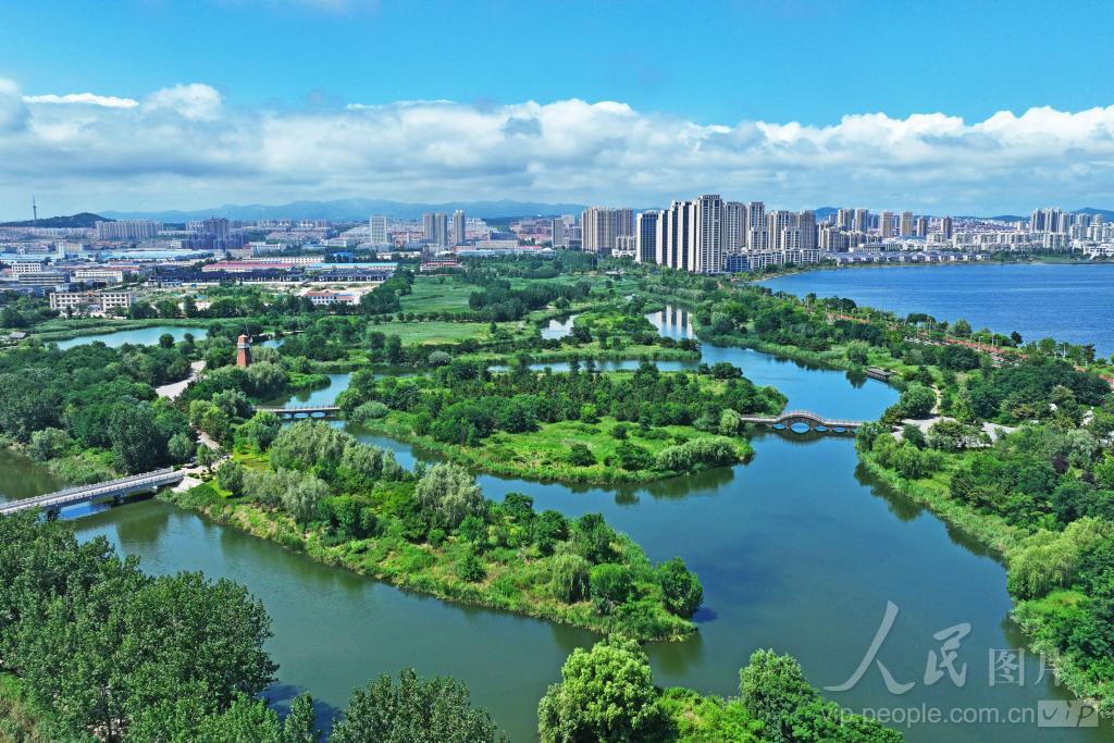 2024年7月15日,山东省荣成市桑沟湾国家级湿地公园与蓝天白云、绿树碧水、滨海小城交相辉映,组成夏日里一幅美丽的生态画卷。