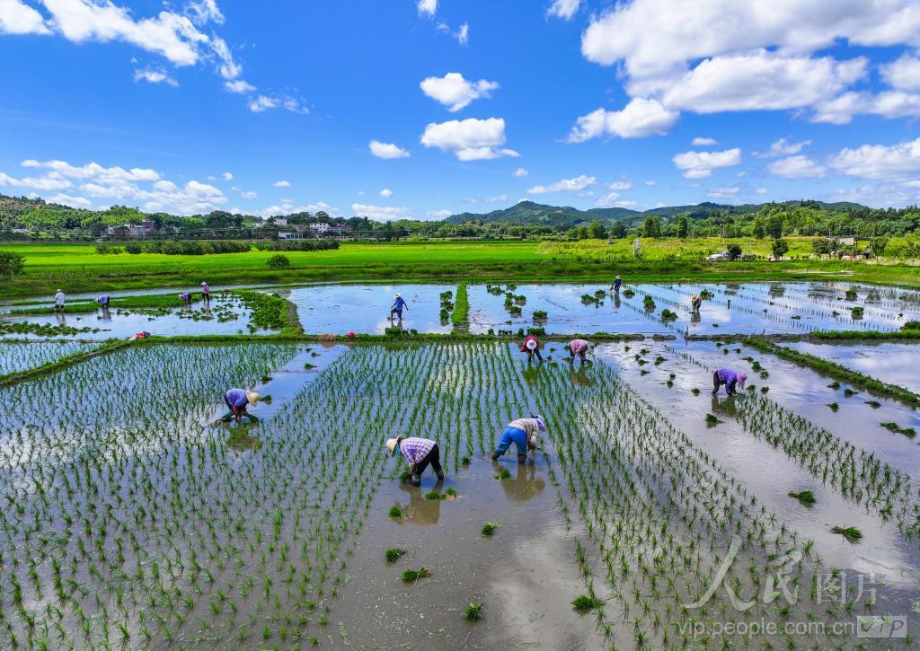 2024年7月18日,江西省抚州市南丰县桑田镇古城村,村民正在移栽晚稻秧苗,田间一片忙碌景象。