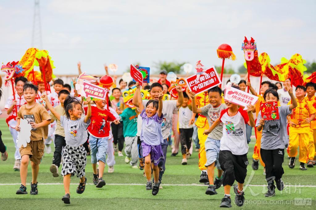 2024年7月25日,在安徽省阜阳市阜南县黄岗镇杨寨小学,泉州轻工职业学院的志愿者和学生们共同为即将开幕的巴黎奥运会送去美好祝福。