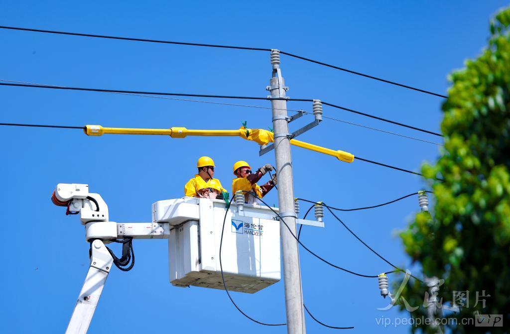 8月1日,在江苏省扬州市江都区小纪镇,作业人员带电搭接担负充电桩供电任务的变压器。