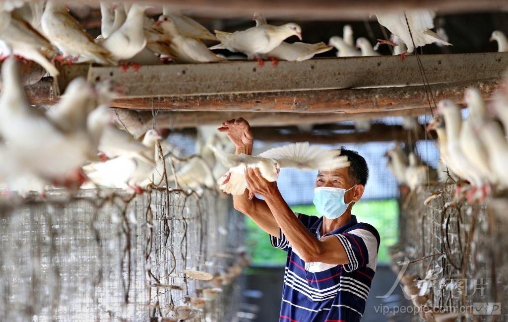 2024年8月1日,在广东省鹤山市古劳镇连北村,养殖户正在喂养白鸽。 该村依托驻村工作队的力量,采取“公司+合作社+农户”的模式,投资发展白鸽养殖项目,帮助村民就业创业,壮大村集体经济和农户收入。