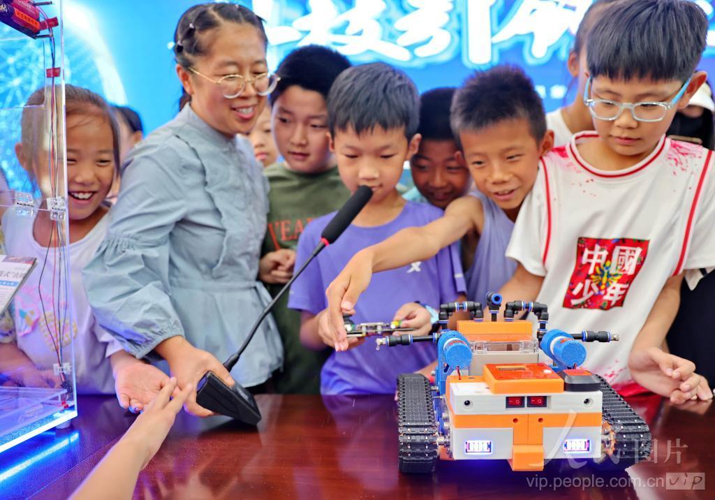 2024年8月2日,河北省秦皇岛市海港区新时代文明实践活动中心(秦皇植物园)内,科普志愿者为小朋友介绍创客作品。