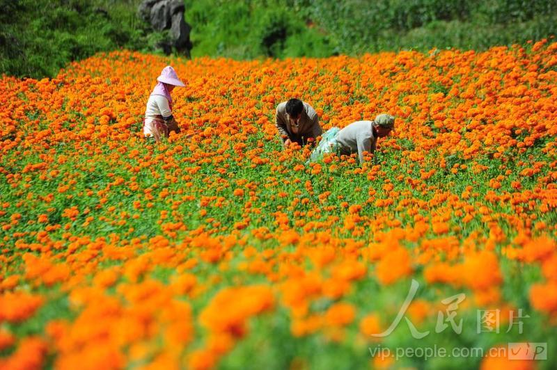 2024年8月7日,云南省文山壮族苗族自治州丘北县腻脚彝族乡架木革村的群众正在采收万寿菊。