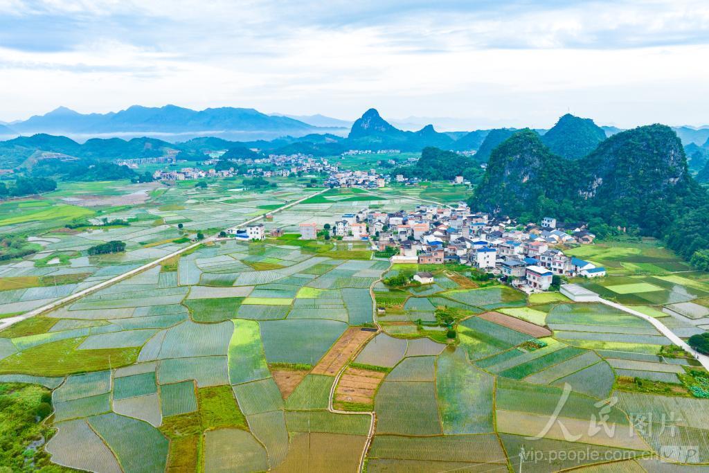2024年8月11日,广西荔浦市修仁镇木山村,田园、道路、喀斯特地貌相映成景,构成一幅秀美的夏日乡村画卷。