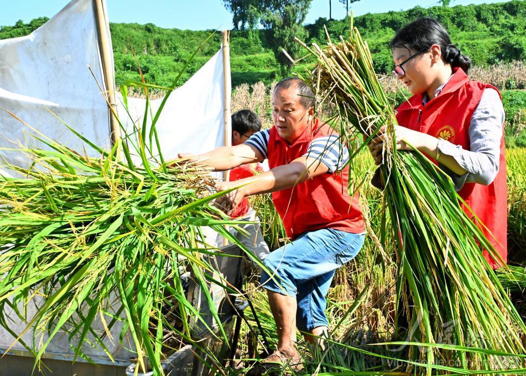 2024年8月13日,四川省眉山市仁寿县彰加镇铁牛村的党员“帮帮团”正在帮助村民收获稻谷。
