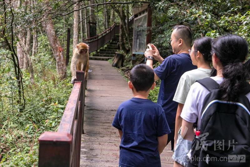 2024年8月24日,在广西来宾市金秀瑶族自治县银杉森林公园,猕猴吸引游客前来观赏。