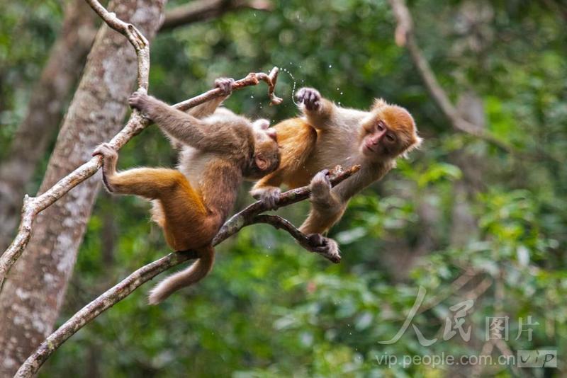 2024年8月24日,在广西来宾市金秀瑶族自治县银杉森林公园,猕猴在树上玩耍。