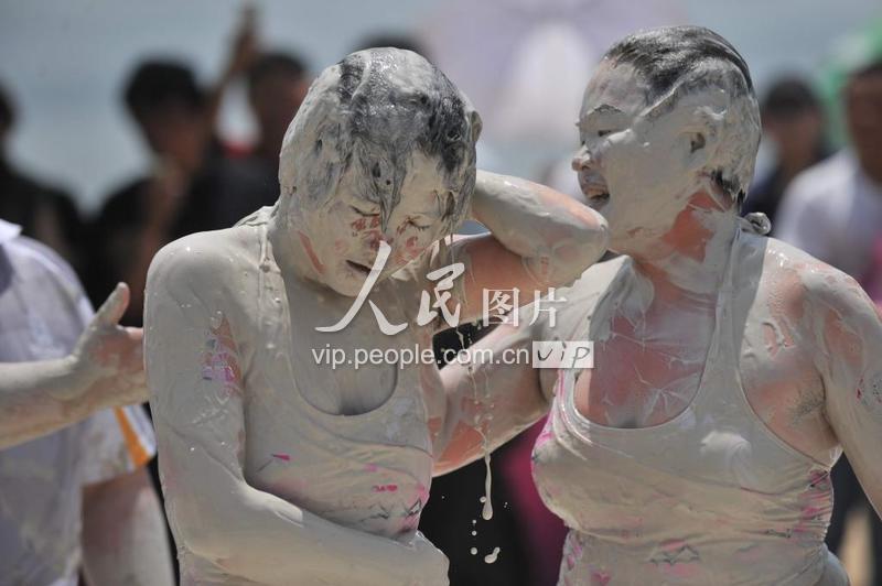 2009年5月3日,两名女孩在东湖沙滩浴场进行泥浆摔跤比赛。