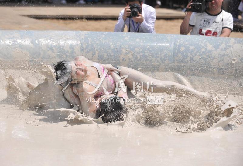 2009年5月3日,两名女孩在东湖沙滩浴场进行泥浆摔跤比赛。 当天,共有40多名女孩参加“湘鄂中外女子泥浆摔跤大赛”,争夺冠亚军。泥浆摔跤既是健身运动又是娱乐表演,狭小的摔跤台上铺一层泥浆,两个女孩使出浑身解数欲将对手摔倒,同时还要小心不被脚下的泥浆滑倒。这些泥浆虽然看上去脏兮兮的,它可是具有美容功效的深海泥,在摔跤过程中,泥浆里的微量元素及有机营养物能够渗入皮肤,据说可以使皮肤细腻、有弹性且更加柔润靓丽。另外,摔跤时双方的相互挤压等于是相互按摩,大汗淋漓之后有一种说不出的畅快感觉。