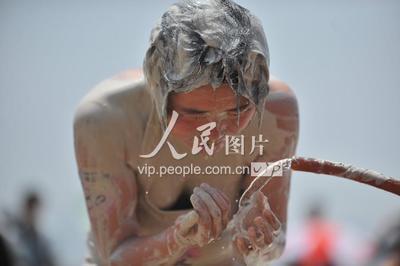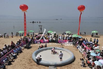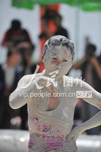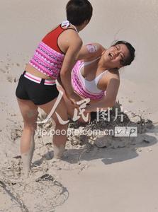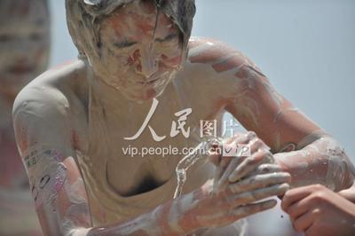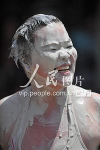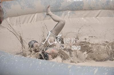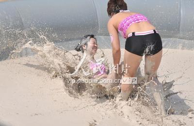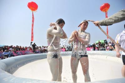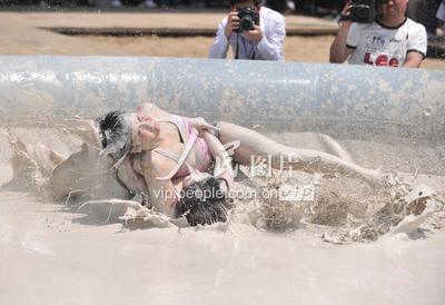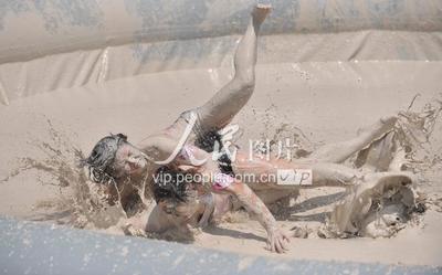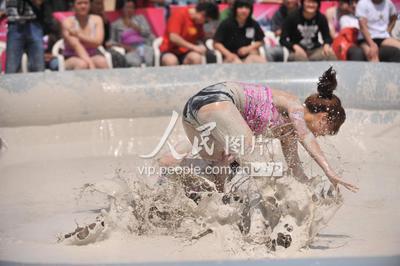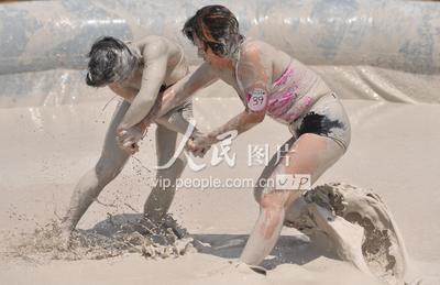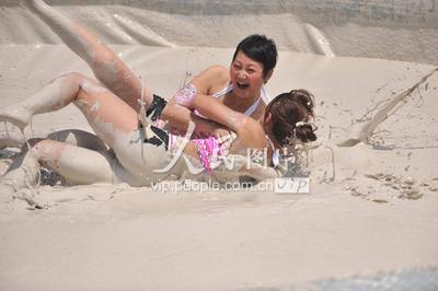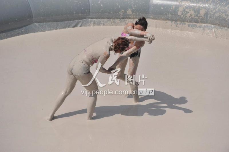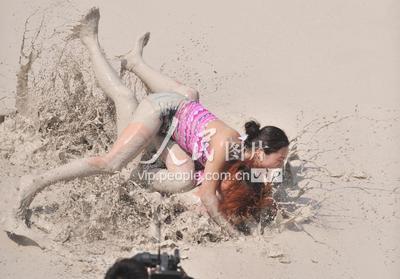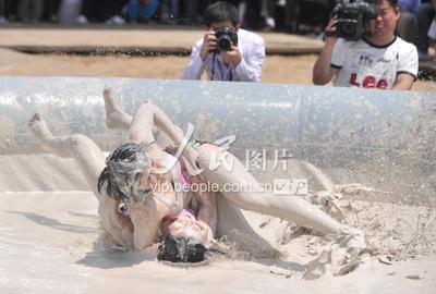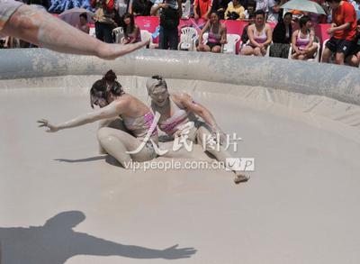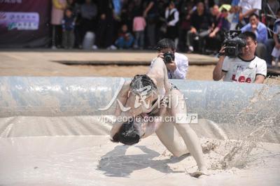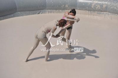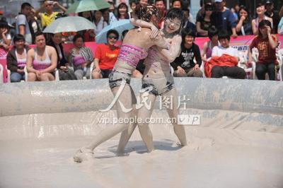 2009年5月3日,两名女孩在东湖沙滩浴场进行泥浆摔跤比赛。 当天,共有40多名女孩参加“湘鄂中外女子泥浆摔跤大赛”,争夺冠亚军。泥浆摔跤既是健身运动又是娱乐表演,狭小的摔跤台上铺一层泥浆,两个女孩使出浑身解数欲将对手摔倒,同时还要小心不被脚下的泥浆滑倒。这些泥浆虽然看上去脏兮兮的,它可是具有美容功效的深海泥,在摔跤过程中,泥浆里的微量元素及有机营养物能够渗入皮肤,据说可以使皮肤细腻、有弹性且更加柔润靓丽。另外,摔跤时双方的相互挤压等于是相互按摩,大汗淋漓之后有一种说不出的畅快感觉。
