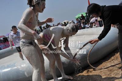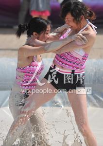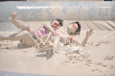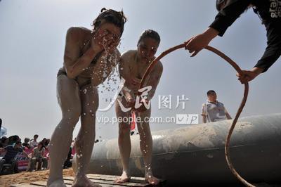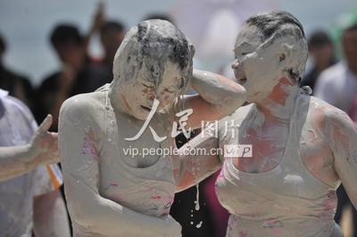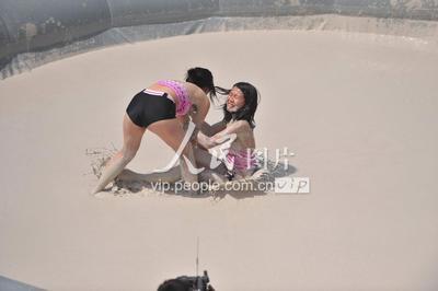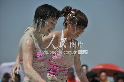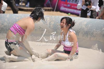 2009年5月3日,两名女孩在东湖沙滩浴场进行泥浆摔跤比赛。