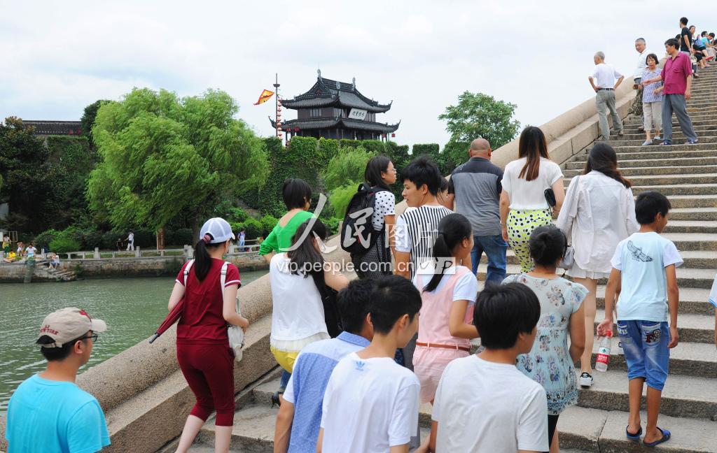 8月9日,许多游客走过苏州古运河上的吴门桥前往盘门景区游览。