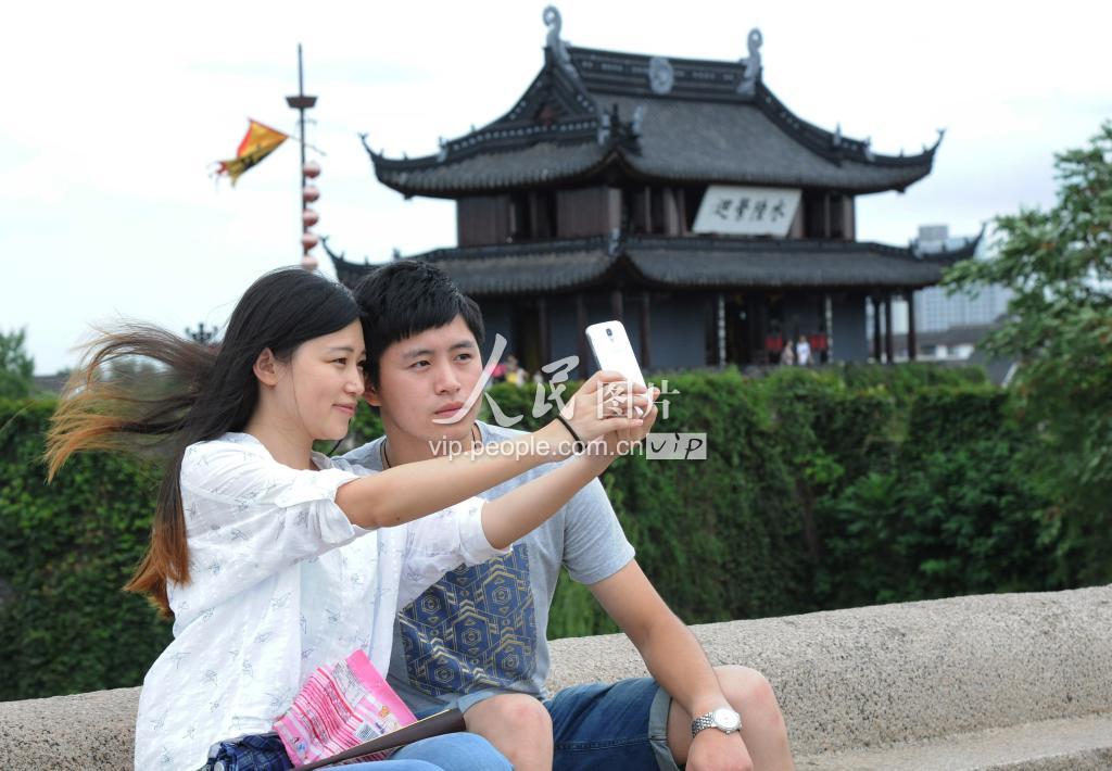 8月9日,一对情侣在苏州千年吴门桥上以盘门城楼为背景玩自拍。