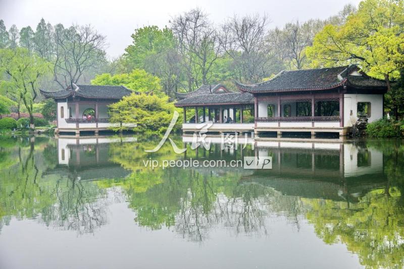 2016年4月3日,拍摄的杭州西湖“曲院风荷”雨中美景。在南宋时,此有一座官家酿酒的作坊非常有名,如今已经成为小桥流水,亭台楼阁,风景如画的景区。