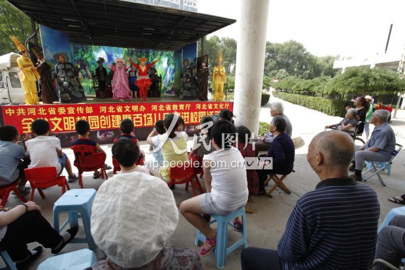 6月9日,河北省话剧院演员在张家口市宣化区福利院为老人和孩子们表演节目。